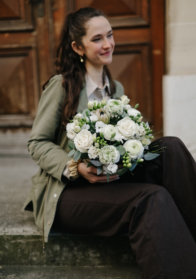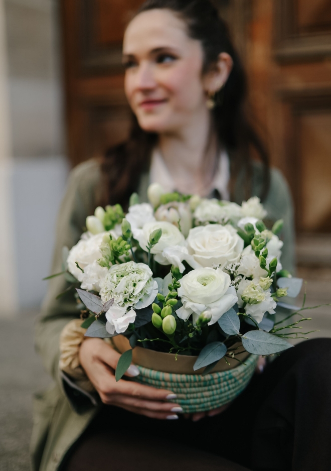 L’arrangement Pearl est présenté dans un panier arrondi TheNomad, tressé à la main à partir de fibres naturelles subtilement mêlées de bleu. Cette touche colorée apporte fraîcheur et caractère, parfaite pour illuminer un intérieur. La composition met à l’honneur des fleurs de saison blanches, dont de délicates renoncules italiennes, pour un arrangement élégant et lumineux. Une création douce et raffinée, où la pureté des fleurs contraste harmonieusement avec la texture naturelle et les nuances bleutées du panier.
