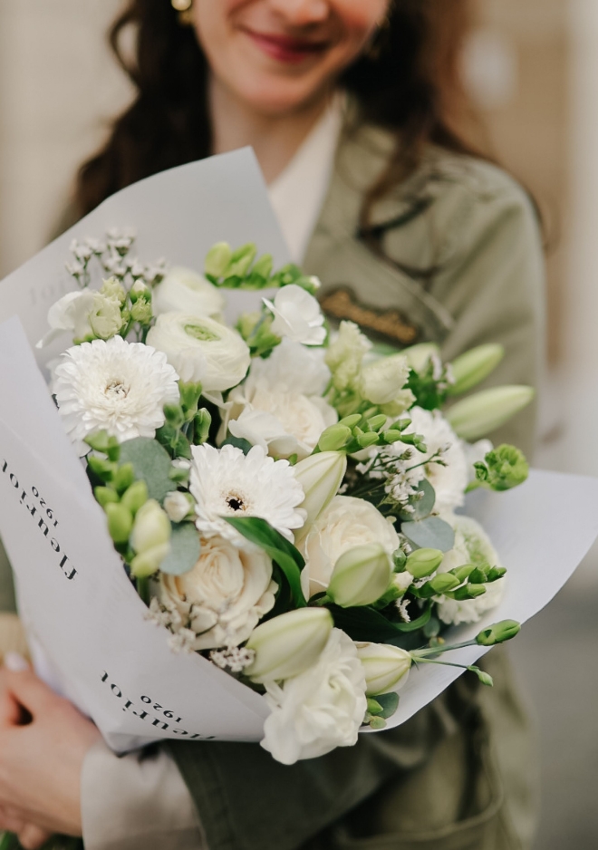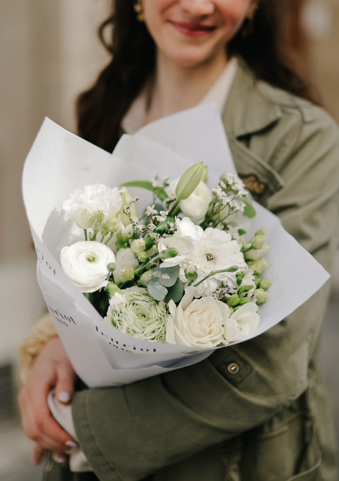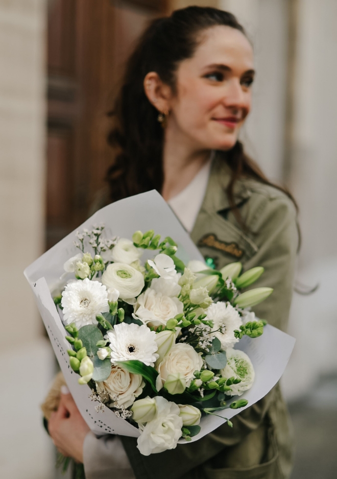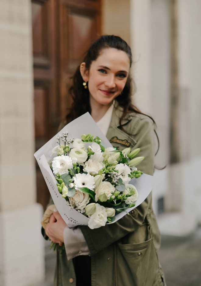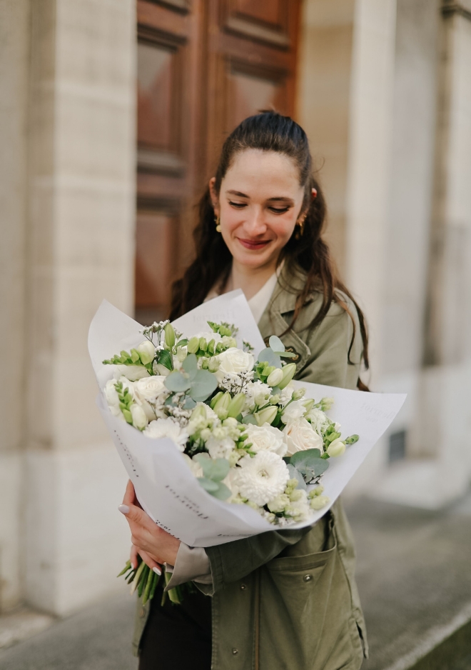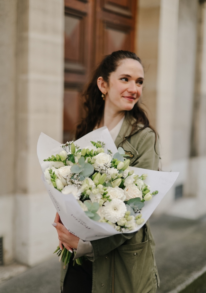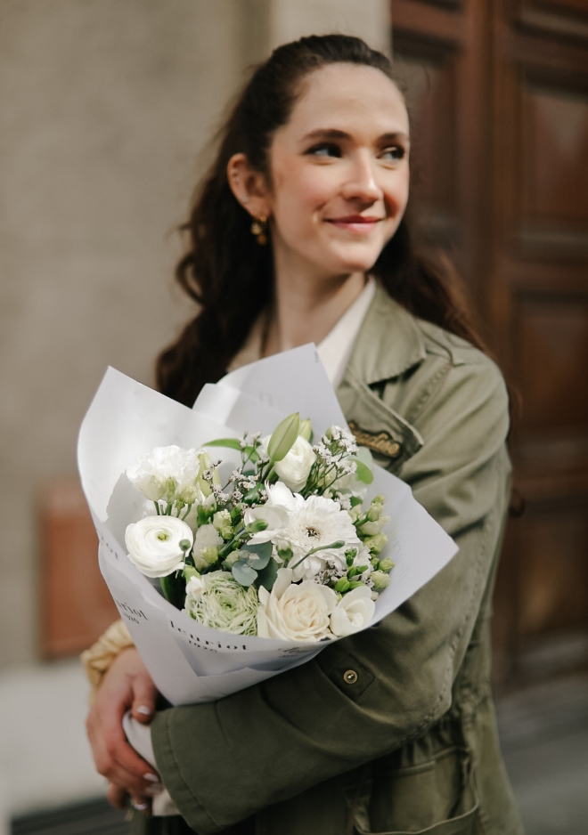 Le bouquet Nâcre réunit une sélection de fleurs de saison blanches dans une composition fraîche et lumineuse. Renoncules délicates, roses Playa Bianca, œillets branchus et freesia parfumés s’associent harmonieusement pour créer un bouquet doux et élégant. Ses nuances naturelles et neutres apportent une touche de fraîcheur et de sérénité, parfaite pour illuminer un intérieur avec simplicité et raffinement.