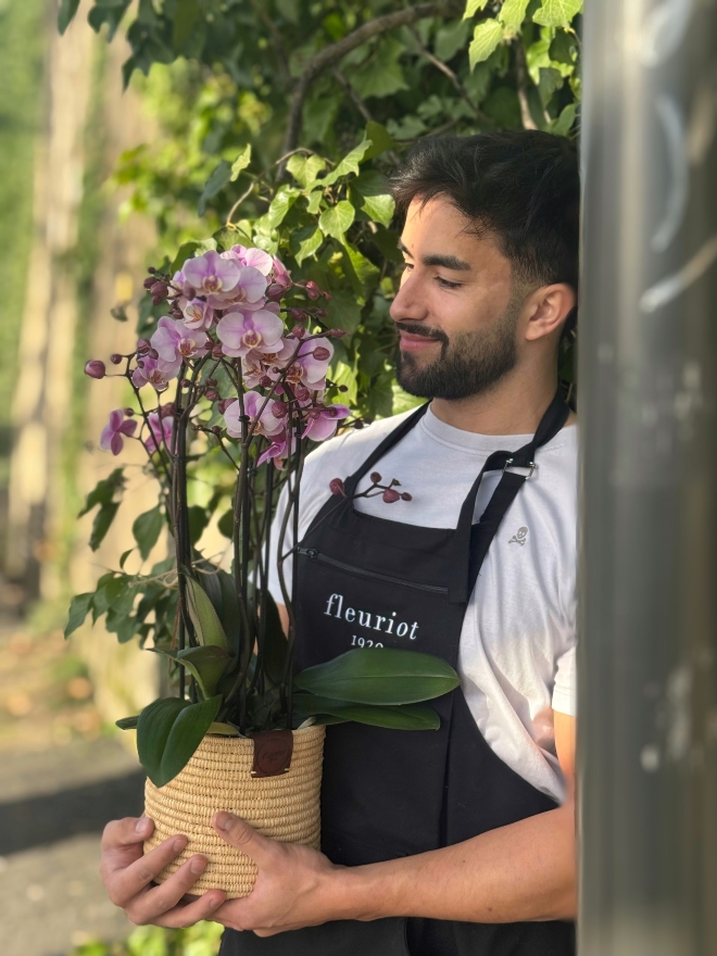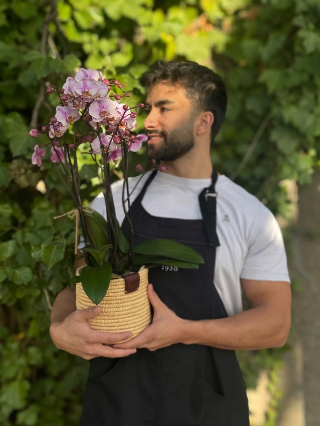 Prenez soin de votre orchidée Phalaenopsis dans son élégant panier marocain La Phalaenopsis, aussi appelée orchidée papillon, séduit par ses fleurs délicates et sa longue floraison. Installée dans son panier marocain artisanal, elle devient un véritable objet de décoration, alliant nature et raffinement. Lumière Placez votre orchidée dans un endroit lumineux, sans soleil direct. Une lumière douce et indirecte favorise une floraison généreuse. Arrosage Arrosez modérément, environ une fois par semaine. Laissez l’eau s’écouler complètement avant de replacer le pot dans le panier afin d’éviter l’excès d’humidité. Les racines ne doivent jamais tremper dans l’eau. Humidité & Température Elle apprécie une température ambiante entre 18 et 24°C. Une légère humidité ambiante est idéale. Conseil d’entretien Après la floraison, coupez la tige au-dessus d’un nœud pour encourager une nouvelle pousse. Avec un minimum de soins et beaucoup d’amour, votre Phalaenopsis sublimera votre intérieur pendant de longs mois. Veuillez noter que les plantes ne peuvent pas être livrées dans les hôpitaux et les cliniques. Nous vous prions de bien vouloir faire votre choix dans la section des fleurs coupées.